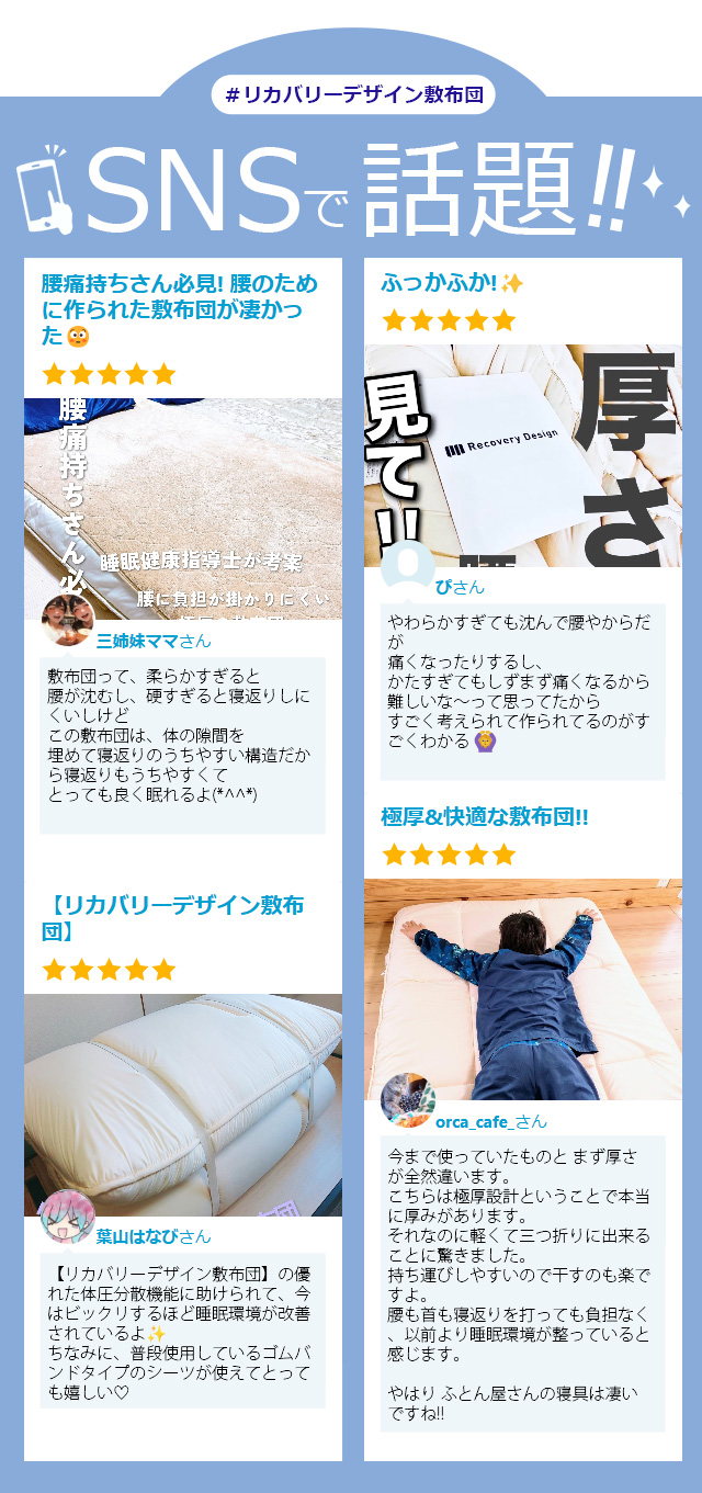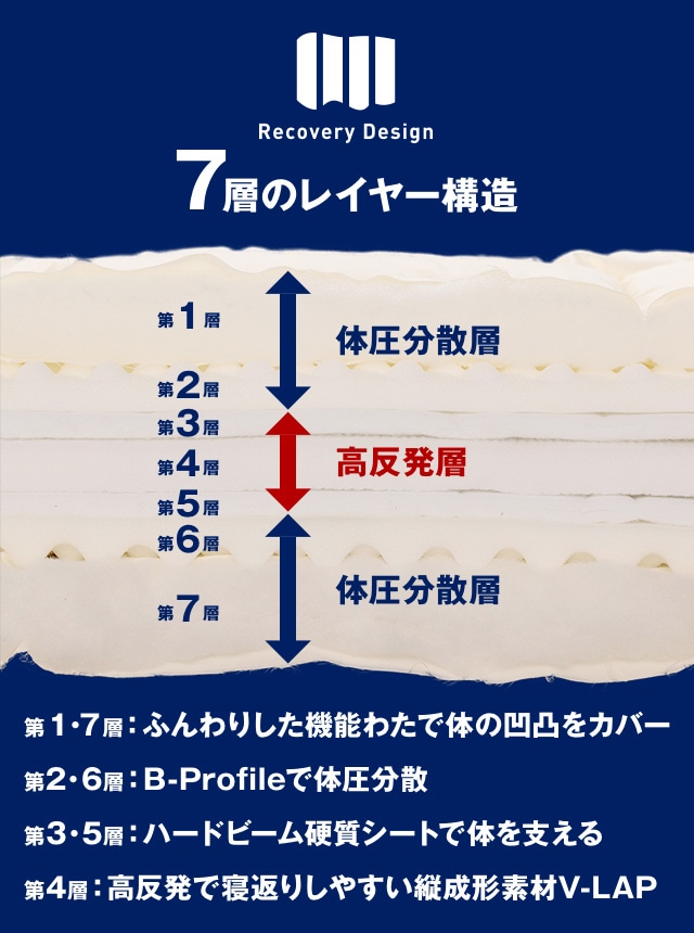 表面は優れた体圧分散性能がありながら、内側で高反発性を兼ね備えているのがRecovery Design敷布団の特徴です。