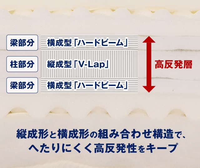 V-LAPRは縦成型の圧縮固綿で高反発を生み出す「柱」、一方でハードビームは「梁」部分に相当します。