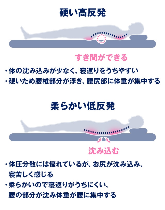柔らかすぎると腰部分が沈み込み、腰に圧力がかかります。また、寝返りもしにくいため快眠できません。