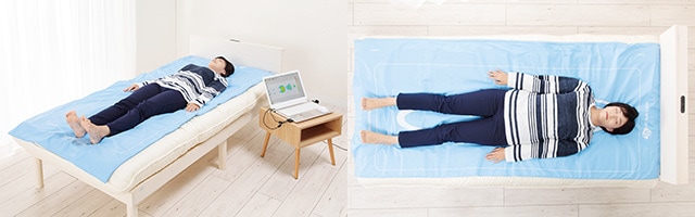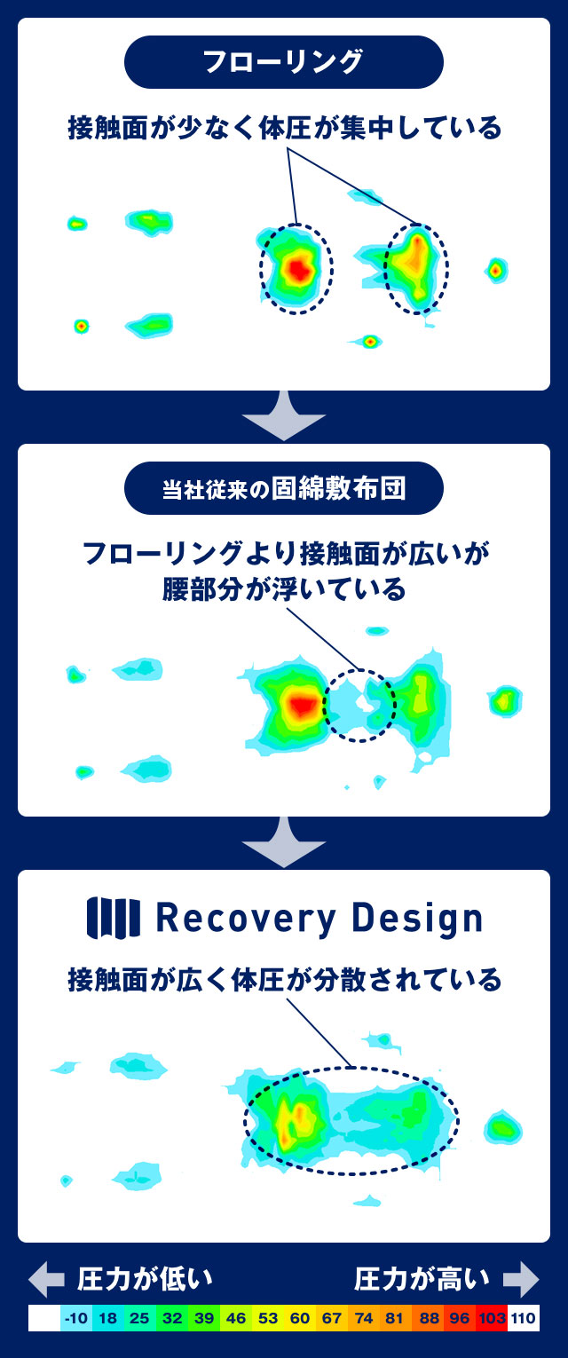 Recovery Design敷布団、当社従来の固綿敷布団、フローリングに直接で寝た場合のデータを測定しました。
